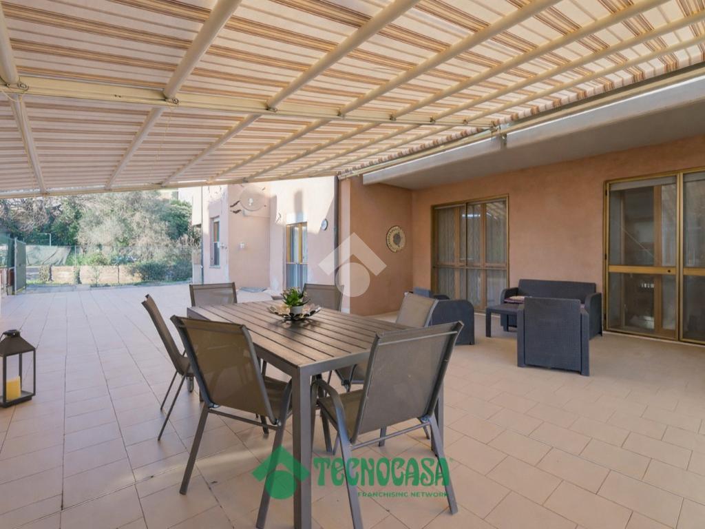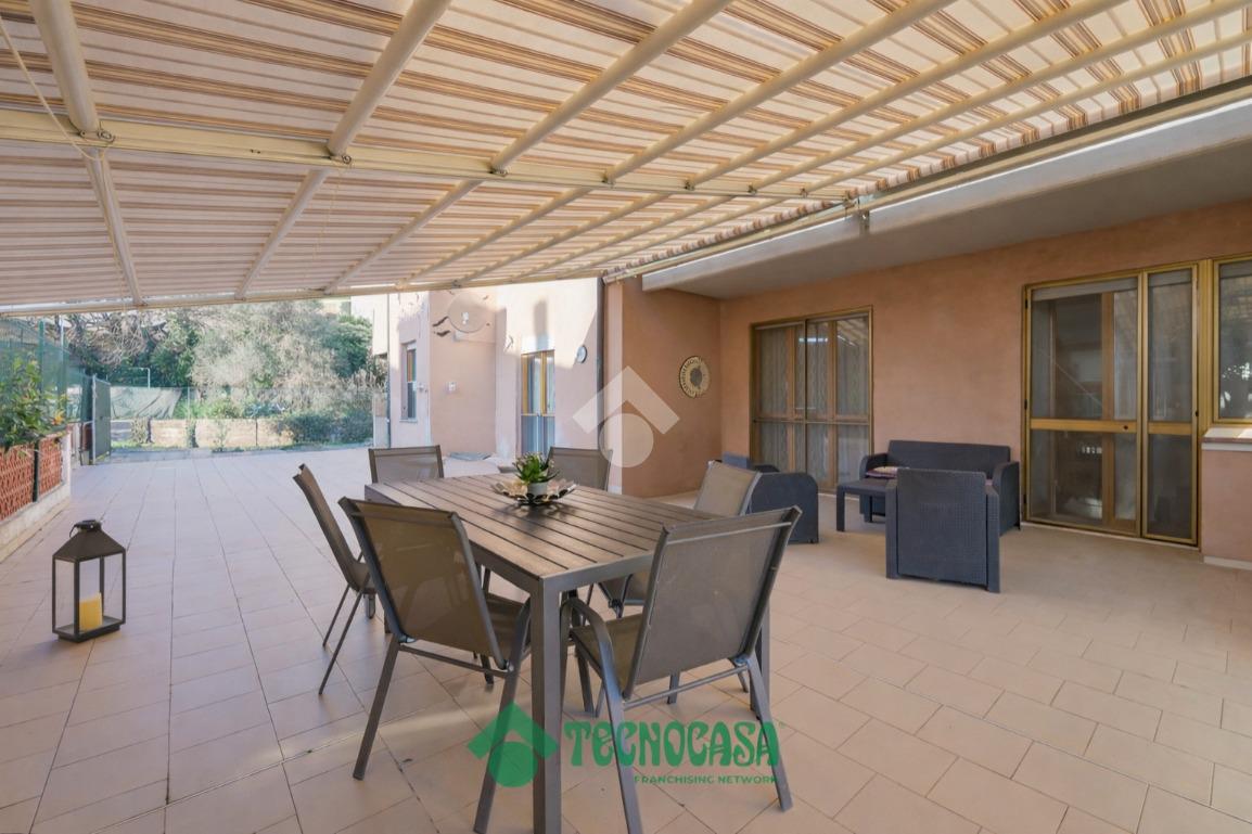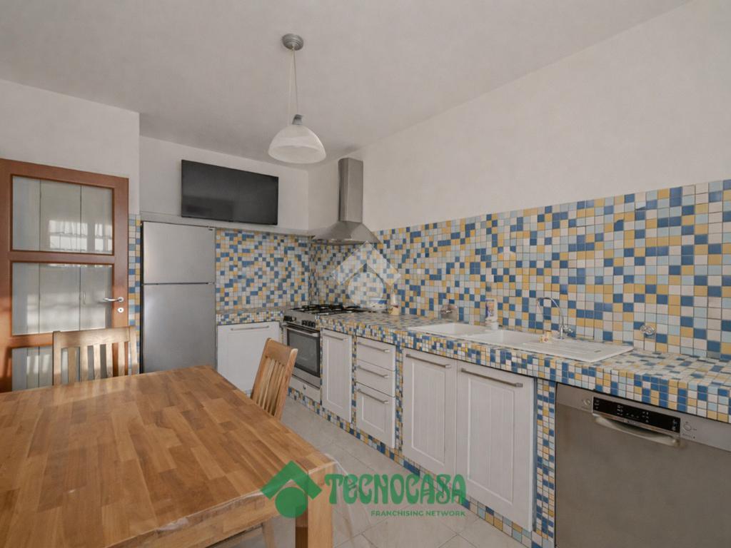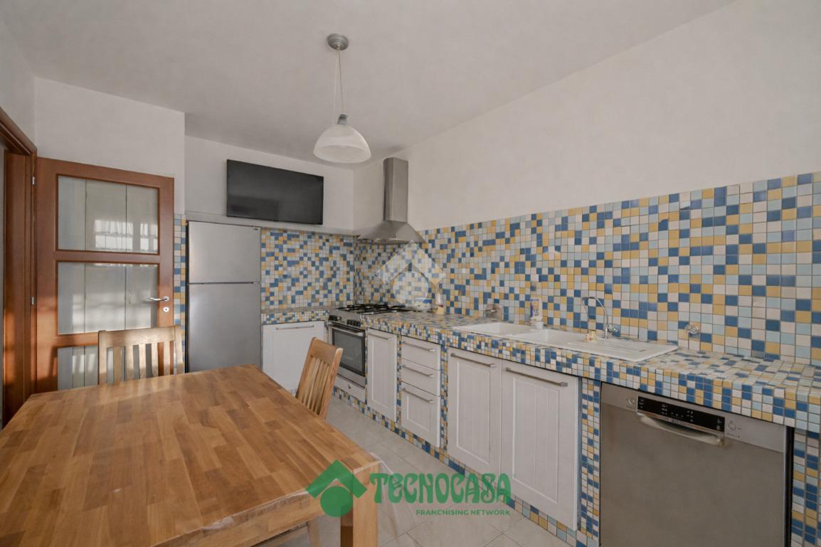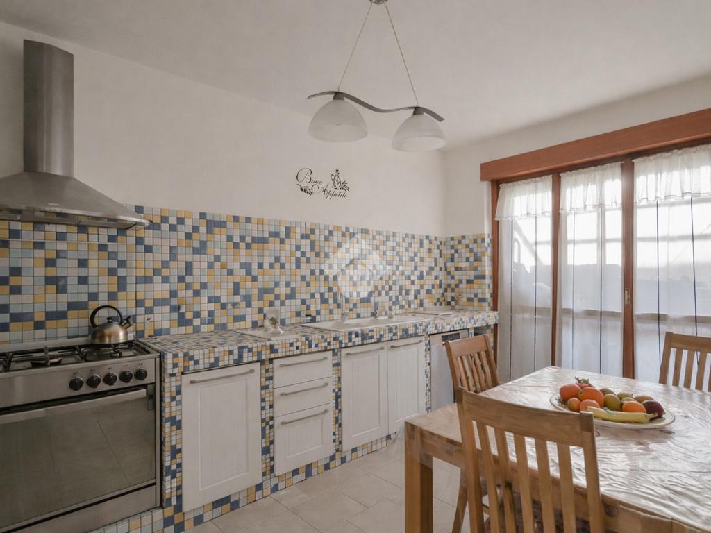 La cucina abitabile, separata dal soggiorno, è dotata di ripostiglio ed è collegata alla corte esterna pavimentata, che si sviluppa lungo il perimetro dell’abitazione.