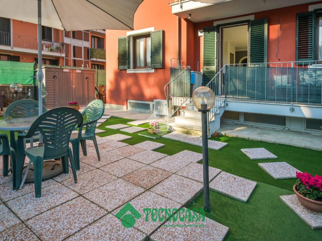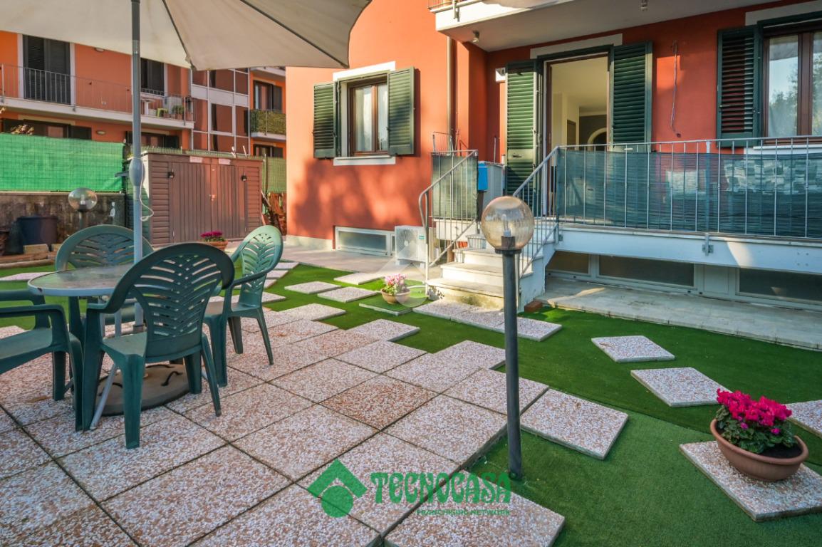 Dal primo ingresso si accede a un soggiorno luminoso con angolo cottura e balcone che porta al giardino. Da qui un disimpegno conduce a una camera matrimoniale, una cameretta e a un bagno finestrato con doccia.